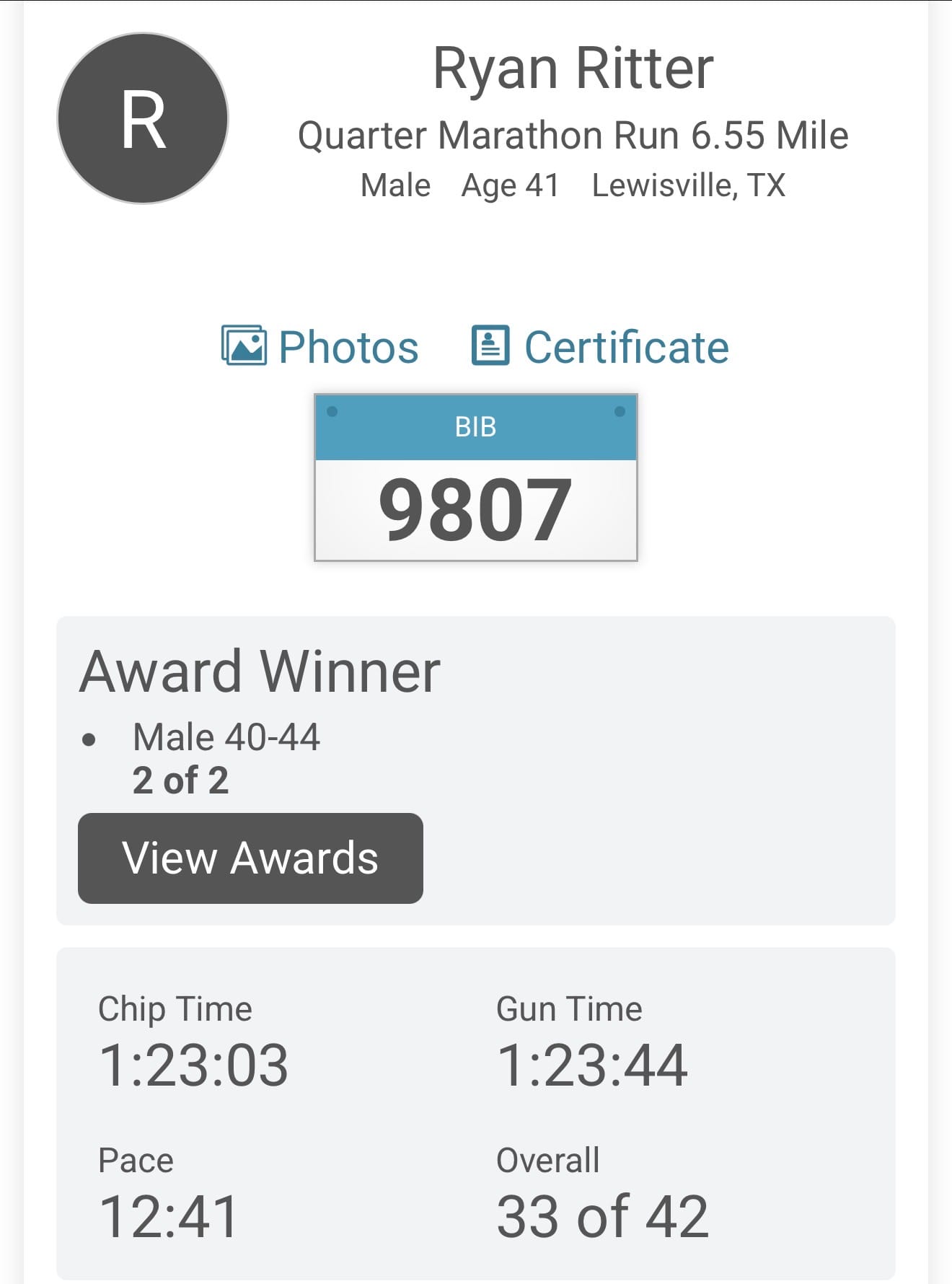 It took two years to finally get down to the running business, but the 10K went down via a quarter marathon because I didn’t realize the two were different. Oh well, bonus three-tenths of a mile or so.
