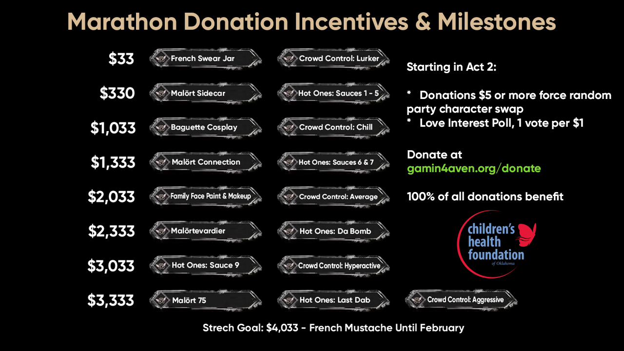 I will keep all the Game Day milestones live. Face painting might be tricky, but I will make sure to cash it in at a stream start to get maximum time out of it. Reminder of the incentives (next one is at $2,033 raised).