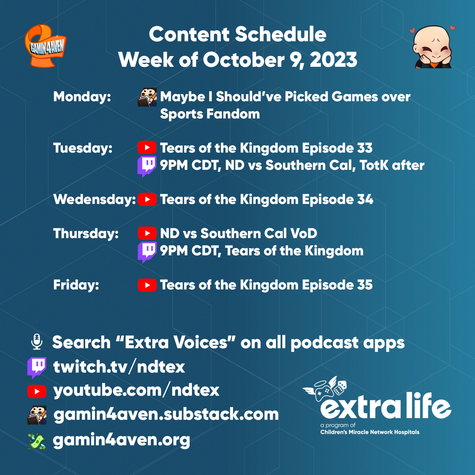 Bumping the VoD schedule back a day. Honestly, trying to edit over the weekend was something I should’ve known wouldn’t work too well with kids’ sports, football, and well, just needing to recharge. Except this cadence going forward with any Crowd Control Highlights sprinkling in the Monday slot.
