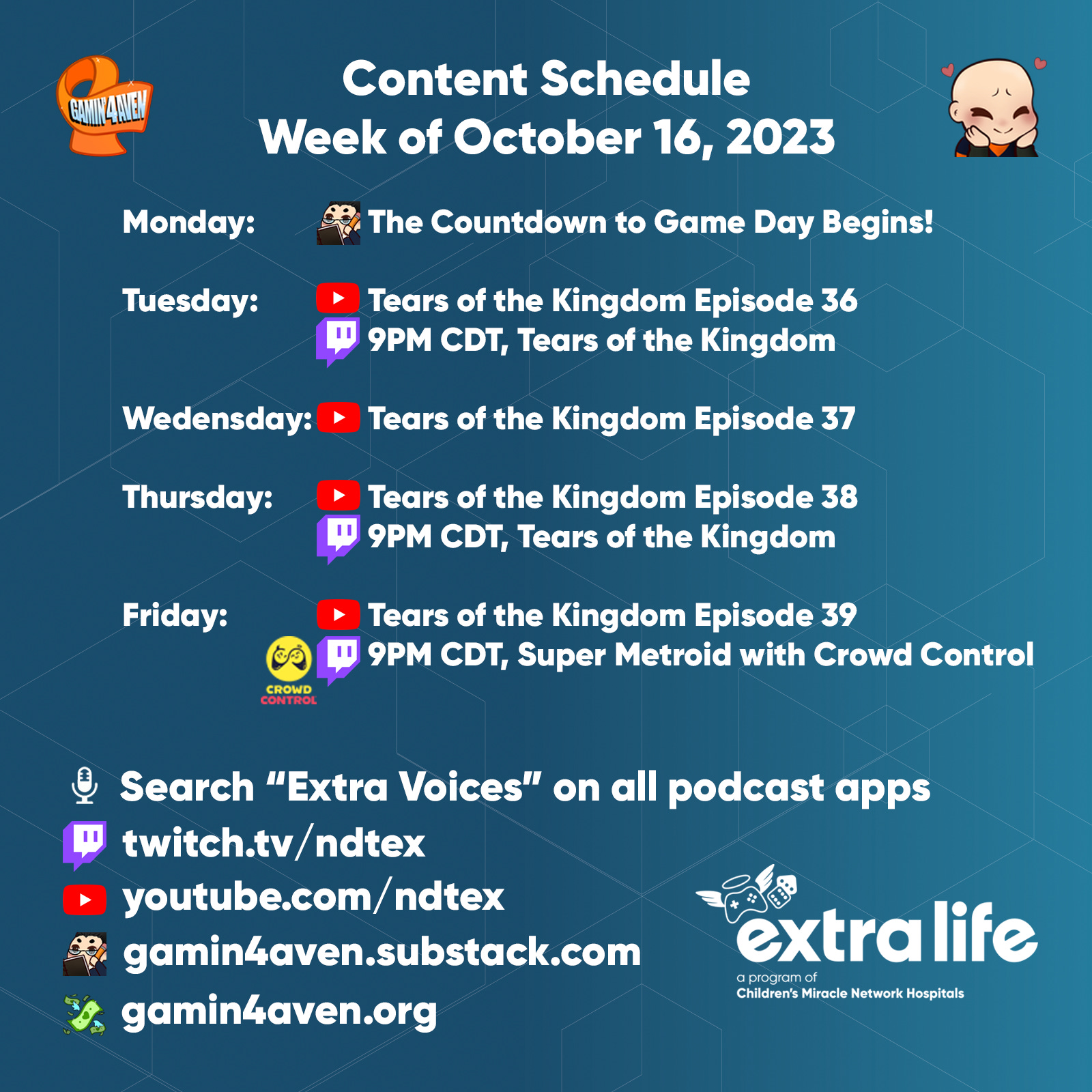 It’s a bye week for ND, so there’s no ND Sim. This is probably a good thing because the donations that hit this weekend will force me to find a Shrine and 11 Koroks before I proceed further in Tears of the Kingdom.